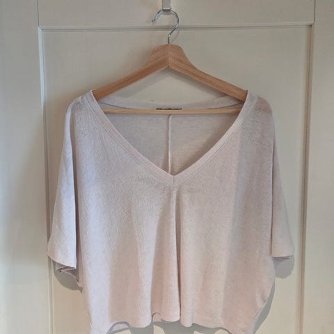 Hvit topp i behagelig elastisk og luftig stoff med dyp utringning. Str XS, men litt stor i størrelsen.