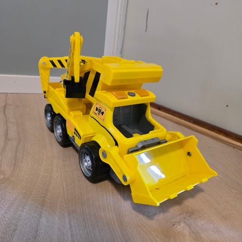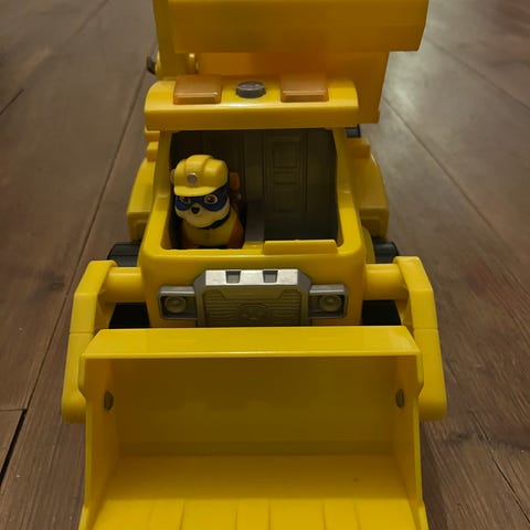 Paw Patrol lekebil gravemaskin - Rubble. Leken har bevegelige deler som skuffe og kran med ball. Egnet for barn som liker konstruksjonsleker.