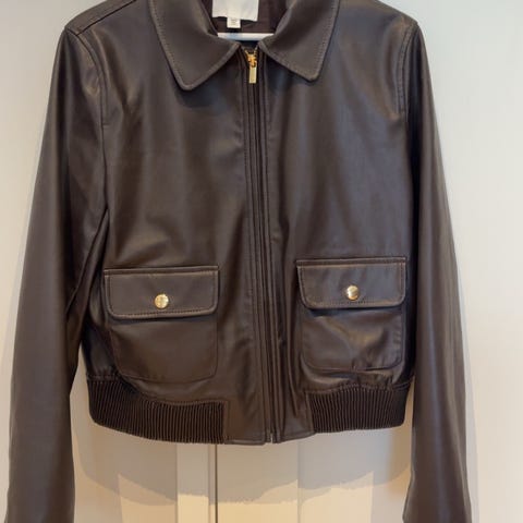 Kul bomberjakke, foret, lommer i sidene, knepping i front, ermer i imitert skinn. Kun brukt en gang og fremstår som helt ny. Passer str M/L.