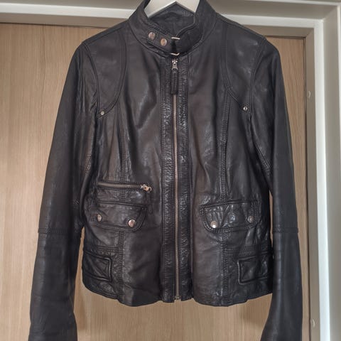 Lekker skinnjakke fra Jazz med silkefor. Glidelås i front og lommer i siden. Pent brukt.