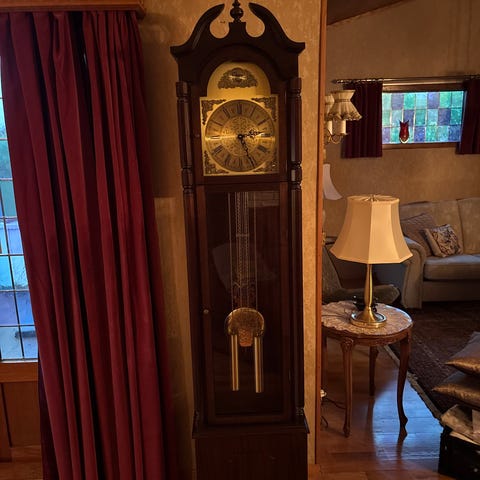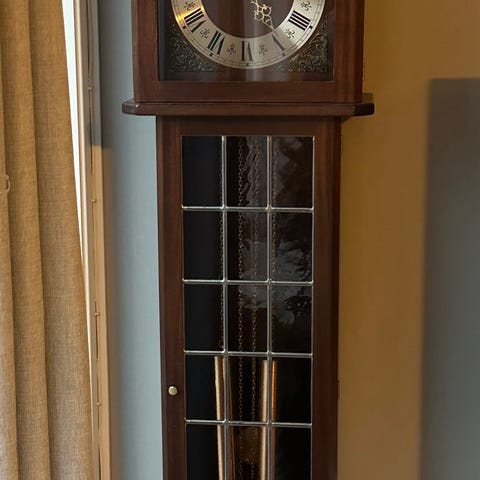 Gulvur/ bestemorsklokke selges. Tikker når den trekkes opp, men har ikke vært i bruk den siste tiden. Enkelte småskrammer på treverket, men i generell god stand (se bilder).