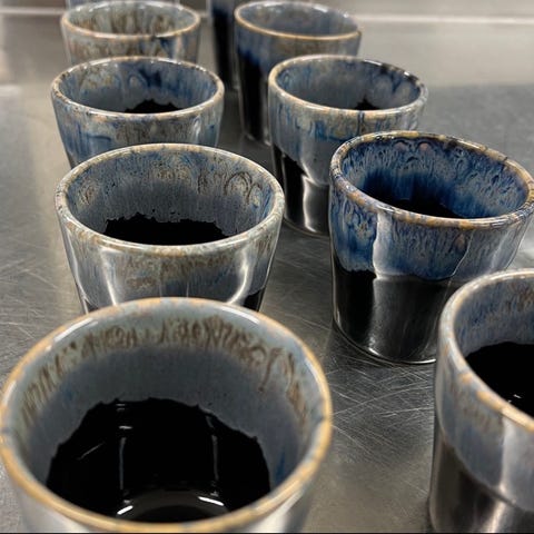3 stk glass-skuffer med hank til tørrvarer på kjøkkenbenken.