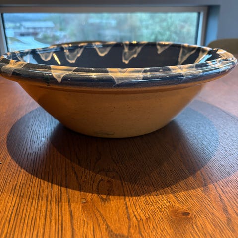 i rødt og brunt. Blank glasur utenpå, matt og ru på utsiden. Hel og pen uten nag, men med noe ujevn blankhet i glasur på innsiden.