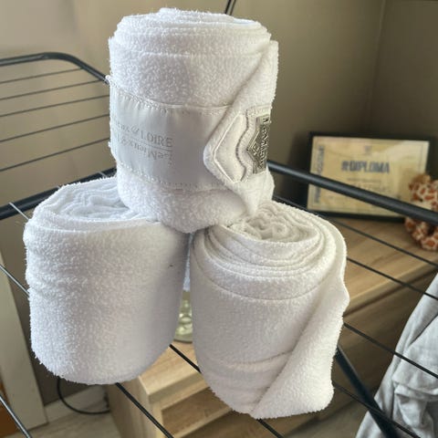 Sett med fire hvite fleecebandasjer fra Royal equus. Pent brukt, hele og pene. I utg.punktet 280cm lange men to av de er klippet litt kortere.