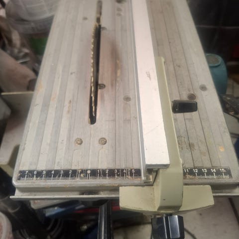 Kløyv-, kapp- og Gjærde sag med robust sagbenk i aluminium. Sagen er utstyrt med justerbare støtte ben for lett å tilpasse ujevnt underlag. Lett å bruke. Lett å transportere.