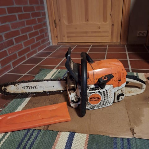 Stihl 026 c motorsag som er godt egnet til tøffe tak i skog og hage. Sagen starter meget lett og vil mene at denne har mange år igjen hvis den får riktig mat og stell/vedlikehold, og selvfølgelig riktig bruk som man kan mene mye om.. Har ikke brukt denne i mitt eie til vedhogst. Se bilder av sagen for selv å vurdere. Ved anbefalt start prosedyre fra Stihl så er denne eksemplarisk. En sag som er noen år,men har et bra rykte på seg. Skulle den sag være av intresse eller noen spørsmål så bare ta kontakt. Pris settes til 5300 kr. Skulle det og være noen spørsmål rundt pris så bare ta kontakt da og. Kan som nevnt sendes. Videosnutt kan sendes for da å se/høre hvordan denne forbrenner sin etanolfrie bensin,da med 3% oljeblanding. 3%, helt riktig,da noe høyere enn anbefalt. Bilder tatt på noen forskjellige steder for å prøve å få de beste bildevisninger,men samme sag ja. Husk å kok kaffe for det er mange bilder her. Tlf 98437280 eller mail. Kan sendes.