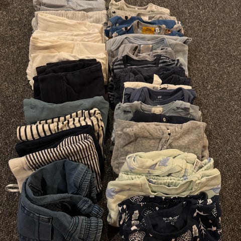 Klespakke str 68, nøytralt. Bodyer, pysjer og bukser. Merker som newbie, hust&claire, lindex, hm, noanoa. Det meste veldig pent brukt.