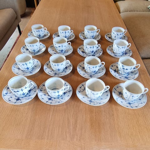 6 flotte kuverter fra 1968. Kopp med kaffeskål. Ingen nagg eller slitasje. Alle delene framstår i nystand. Tynn, nesten gjennomsiktig støp.