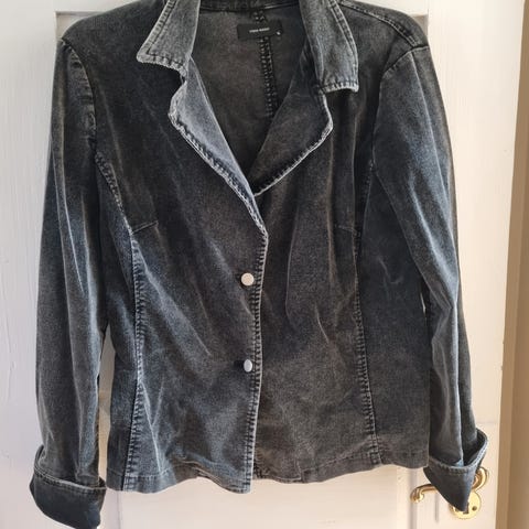Svært pen jakke i «nervøs fløyel». Brede skuldre og ellers fasongsydd fint snitt. . Fra den tiden da vi fortsatt hadde konfeksjonsydde klær i Norge. Jakken er foret og har en god sømkvalitet.Myk og behagelig i bruk. Vintage klærne kan ha noe duft av loft , da de ikke har vært i bruk på en del år.