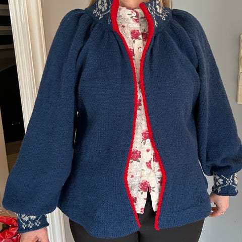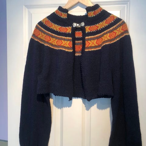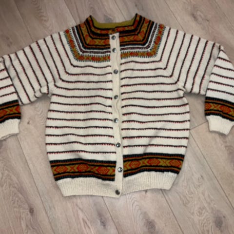 Kort strikket jakke til Vestfoldbunad. Passer til Grethe modell 132. Overvidde: 112 cm, høyde uten krage: 38 cm. Erm: 49 cm. Tinnhekte foran. Ingen dyr og røykfritt hjem. Koften er ny og ubrukt