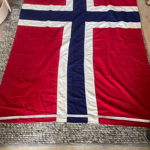 Gammelt norsk flagg i linkvalitet. Laget av Adaco, A. Dahl & Co, Trondheim. I god stand. Gårdens stasflagg, brukt hovedsaklig i finvær. Dimensjon 500 x 350, for 16 meter flaggstang.