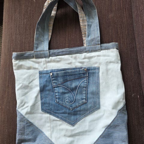 Veske sydd I restestoff og en shorts. Foret og med to lommer. En med glidelås. Mål på vesken er 47x42 cm. Hankene måler 62cm.