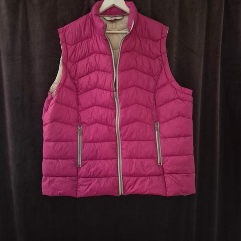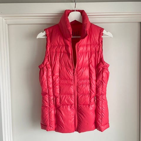 Dunvest fra Etage, med sjenerøst dunfyll og vakkert design. Fargen er en blanding av rødt og rosa, og gir livlige vårvibber. Fylling 90% dun, 10% fjær. Størrelse 36, kommer med en veske for enkel oppbevaring mens du reiser.