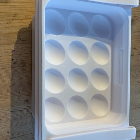 Med plass til 12 egg, festes enkelt i kjøleskaphyller.