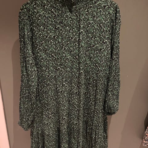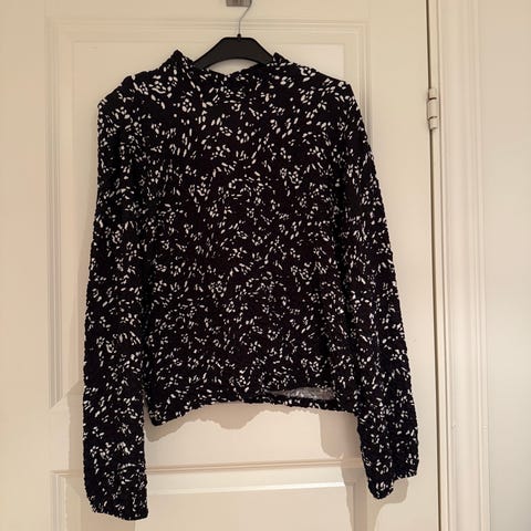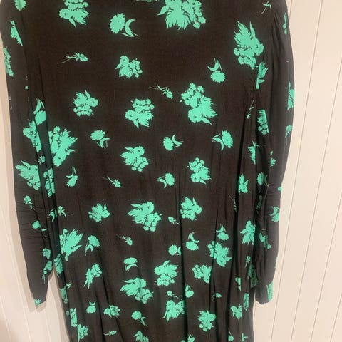 Enkelt redesignet bluse til salgs. Dette var opprinnelig en kjole fra Lindex. Jeg har klippet den av og lagt den opp til en bluse. Mørkeblå og grønn, småmønstret, i str. S, men passer fint en str. M også. Behagelig elastikk rundt håndleddene og halsen, ellers helt enkel og rett i fasongen.