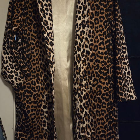 Jeg vurderer å selge min leopardmønstrete, lange blazer/jakke. (Min faste festival- & konsertjakke!) For omtrent 15 år siden kjøpte jeg denne jakken brukt, så jeg tror den er vintage. I årenes løp har jeg gjort noen forandringer på jakken: fjernet skulderputer og byttet ut de opprinnelige plastknappene med noen enkle, fine knapper i tre. Jakken/blazeren er ikke foret. Den er i behagelig og litt stretchy babycordfløyel. God lengde. Merket er Sasparilla.