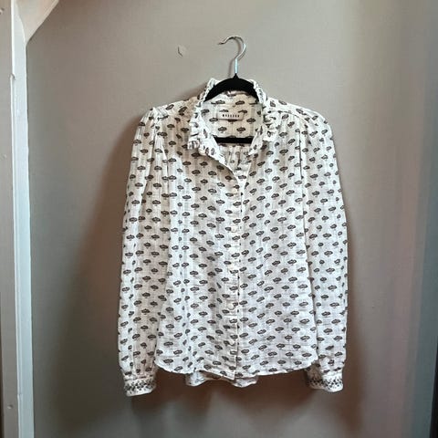 Skjorte hvit i bunn med små søte katter. Ermene kan rulles opp og festes med en hempe. Str L selges kr 120,-(6)