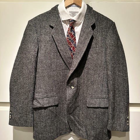 Fremstår som ny,nydelig kåpe til våren og til kaldere sommerkvelder . Lys beige farge,armene kan brettes opp så får man kontrast stoff med striper . To dype lommer på sidene,samt praktiske innelommer. Myk for ,lukking med knapper foran og under kragen ,splitt bak.
