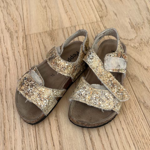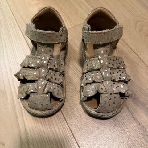 Pent brukte sandaler av 1 barn. I fargen sølv med blomst i str.29.
