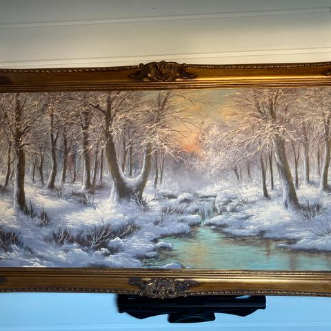 Adalbert Gabris maleri som viser et vinterlandskap med snødekt terreng, trær og en bekk. Maleriet er innrammet i en dekorativ gullramme. Signert av kunstneren Adalbert Gabris.