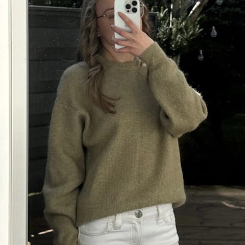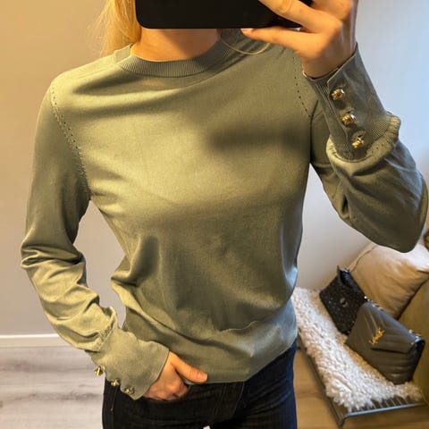 Superdeilig, myk genser i mintgrønn farge. Gullknapper på skuldrene, hvor noen av dem har hint av slitthet, men ser bra ut. Det følger med en ekstra knapp.