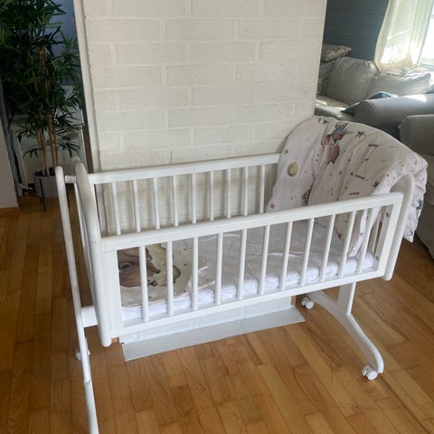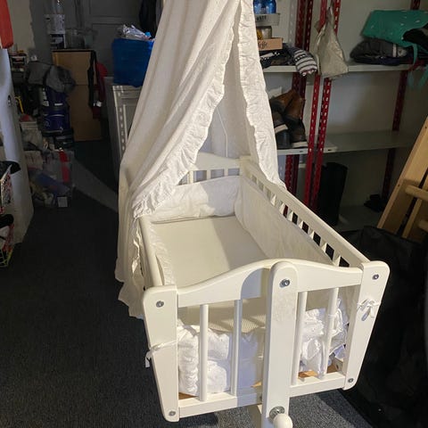 Selger en sjarmerende babyvugge med tilhørende sengehimmel, sengekant( stoff)madrass og sengetøy.
