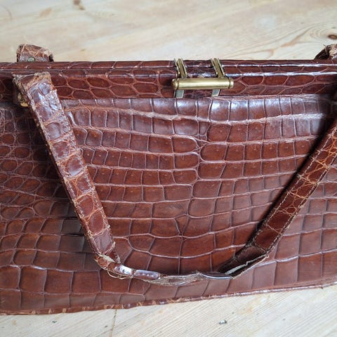 Retro krokodille skinnveske med skulderrem fra.80 tallet 25x25 cm. Selges kr. 250.-
