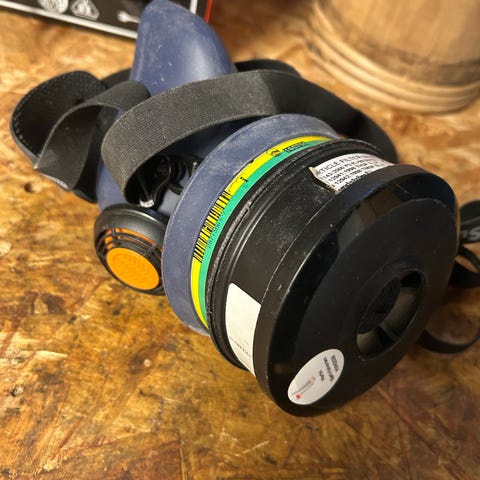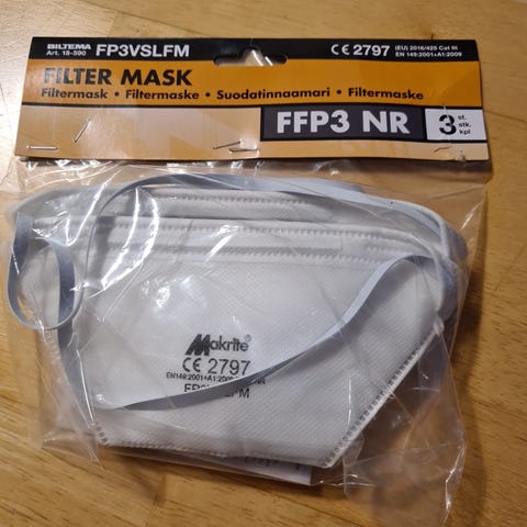 Nye filter til arbeidsmaske. Det ble en feil kjøp til den maske vi har. Posen er åpnet men filter er ikke testet da koblingen er feil til vår maske.