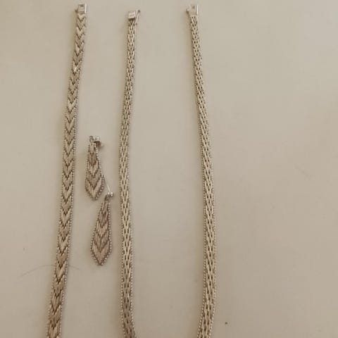 Smykkesett i ekte sølv (925S) med perler av perlemor og zirkonia som dekorstener. Settet består av halskjede og øredobber og er kun brukt ett par ganger. Ingen synlige bruksmerker eller slitasje.