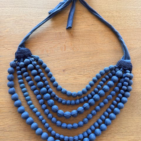 1 spesielt, annerledes og flott halskjede. L. 49 cm. En lærsnor i hver ende, L. 75 cm, 90 gr. Har store blå/turkise kuler, ca 3 cm og noen mindre i brunt, ca 1,5 og 1,9 cm tykke. Helt og fint, meget pent brukt. De blå/turkise kulene er i tekstil