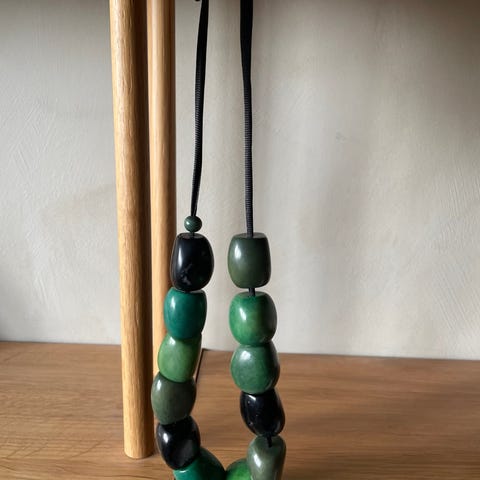 1 spesielt, annerledes og flott halskjede.L.49 cm, lærsnor, 2 stk á 75 cm, 90 g.