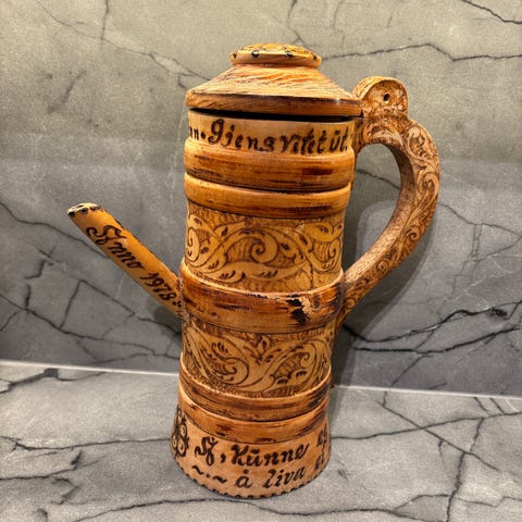 Meget flott kanne laget av Asgeir Torfason på Island i 1997. 25 cm høy, 2 småskader på trebåndene som jeg har tatt nærbilde av.