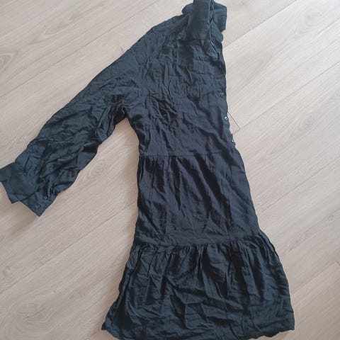 Deilig, luftig kjole i str.M - ypperlig som "den lille svarte"? Utringningen er veldig dyp og jeg har brukt en sikkerhetsnål for å holde den litt mer samlet - sikkerhetsnål medfølger ikke. Den er åpen på oversiden av ermet, men strikken nederst er hel. Stopper midt på låret/litt over kneet, avhengig av brukerens figur. Veldig fin med et belte i livet også for å fremheve figuren.