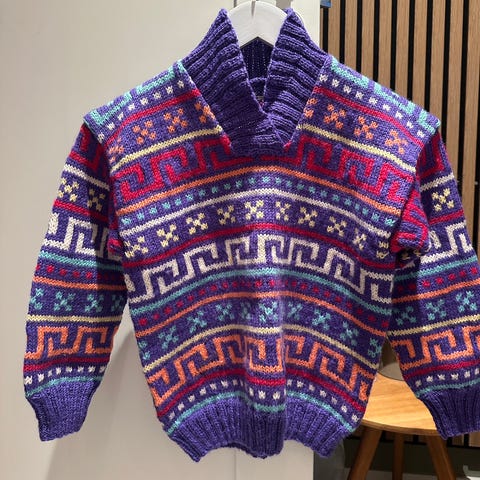 Hjemmestrikket amandagenser / American dream i fin blåfarge selges. Ubrukt da den ble for liten her. Lengde 50 cm, ermer er 40 cm.