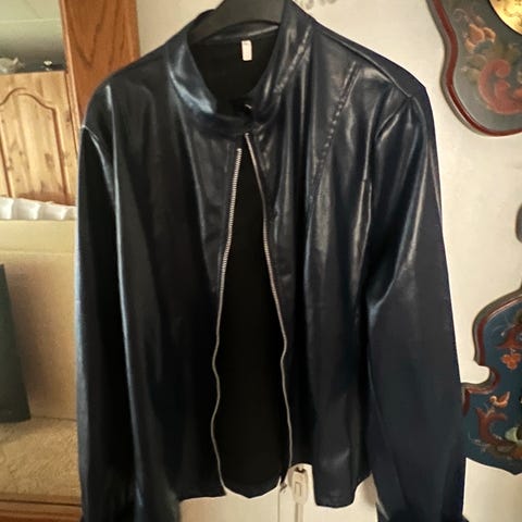 Skinn jakke (imitasjon) med hette str L. Merket XL, men litt liten i str. Fra New Yorker. Ny pris var rundt 1000,-/1200,-