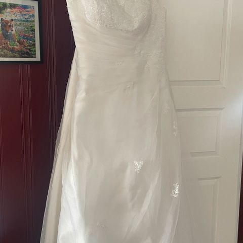 Stroppeløs Agape brudekjole, hvit silke og tyll, aldri brukt, kun prøvd i brudesalongen, sitter veldig pent på.
