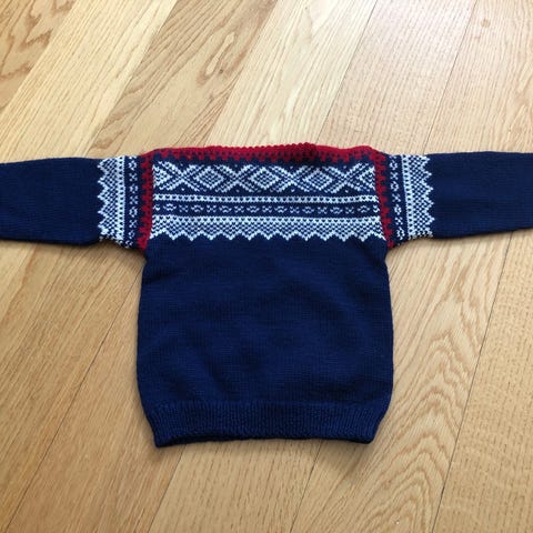 Denne fine Mariusgener er håndstrikket og har vært brukt hos oss av to barn. Den har fått noen små skjønnhetsfeil (se bildene).