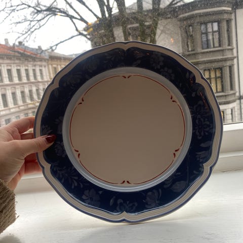 Ønsker å kjøpe disse tallerkner, interissert med både blå kant og rød. Verken til middag eller frokost . Helst feilfrie.