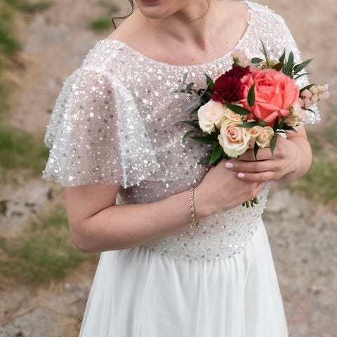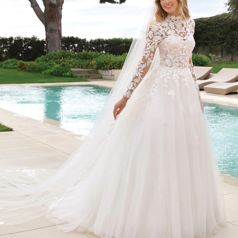 Nydelig elfenbein/ivory brudekjole fra White One Barcelona. Den har fine blonder og et stort tyllskjørt. Kjolen har slep og er kun brukt en gang. Kjolen har korsett bak og kan derfor muligens passe til både str. S og M. Jeg er 160cm høy og str. S. Kjolens nypris er 21 600kr.
