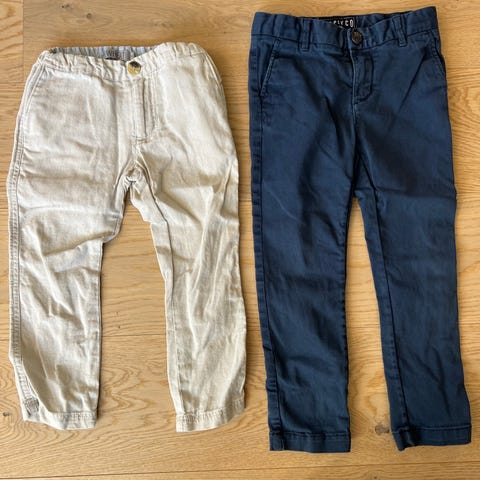 To helt nye bukser. Fikk i gave fra Spania, men dessverre litt små. Tilsvarer mer str 92 enn 3-4 år som det står på dem.