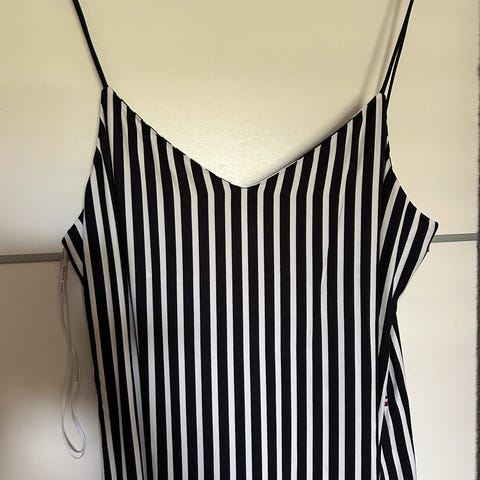 Selger sommerkjole med hvit og mørkeblåe striper, fra HM, i størrelse 46. Nesten ikke brukt