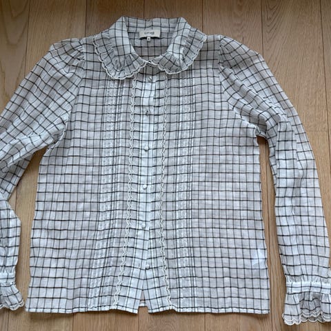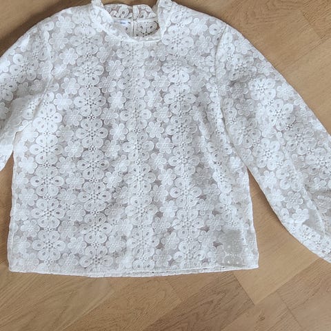 Knappene er stofftrukne og er gruppert i tre stykker , se bilde ( ingen mangler, det er slik designet er ).Små feminine puff ermer. Brukt, ingen skader. Feminin