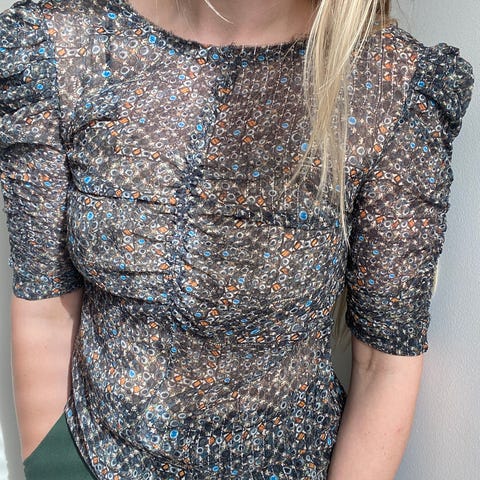 Veldig fin selskapstopp i gullfarget stoff på sort bunn med sort tynt for inni. Toppen er ikke brukt, da den er litt for stor for meg. Og blir dermed dessverre hengende i skapet. Den har gode ermer med litt vidde som når nesten til albuen. Gullfargen kommer dessverre ikke ordentlig frem på bildene.