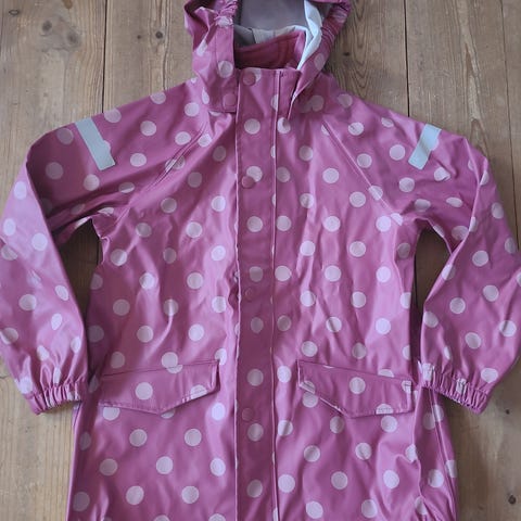 Regnkåpe fra Reima i str. 110. Godt brukt, men mye bruk igjen. Noen flekker (se bilder).