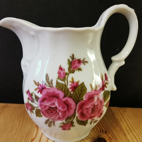 Muggen er ca. 8 cm høy og sukkerskål en ca. 8 cm pluss knotten oppå.