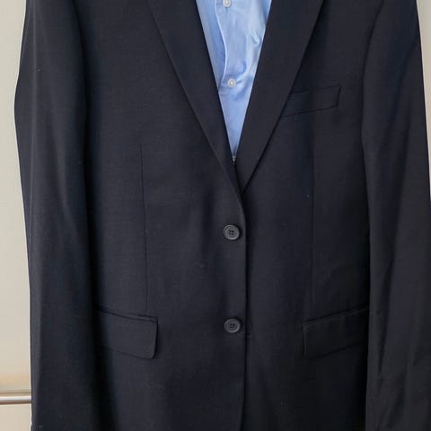 Fin, mørk blå dress, til konfirmasjon, kjøpt på Dressmann, jakke slim fit str 44. Nypris 1400,- bukse slimfit str 30/30 Nypris 799,-. Uten skjorte og slips