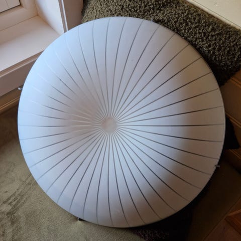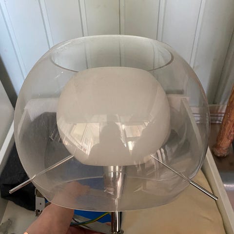 Pent brukt kuleformet bordlampe i matt glass med bryter på ledningen.