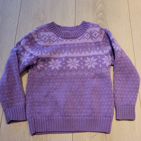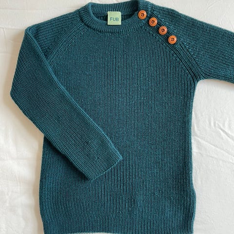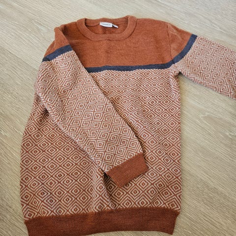 Nydelig mørkeblå ullgenser med brune details. Kun brukt 1 gang til pent i et par timer. Fremstår som ny.