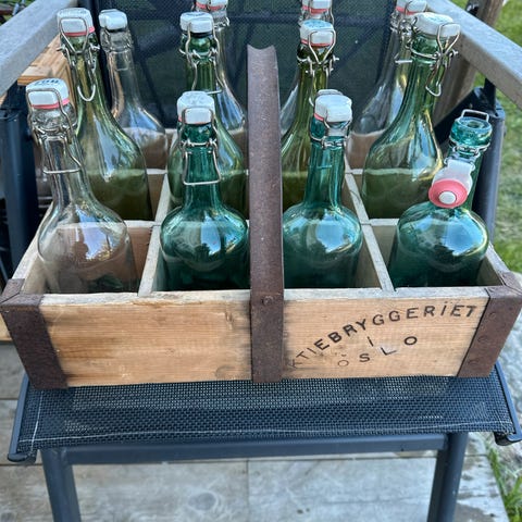 Forskjellige glassflasker selges for 70kr pr stk eller høystbydende.