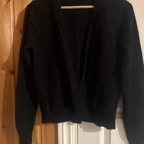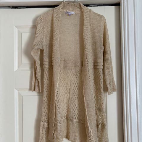 Søt lang strikket cardigan med 3/4 arm. Etikett klippet bort. Vaskes på 30 gr. Antakelig blanding av bomull/viscose